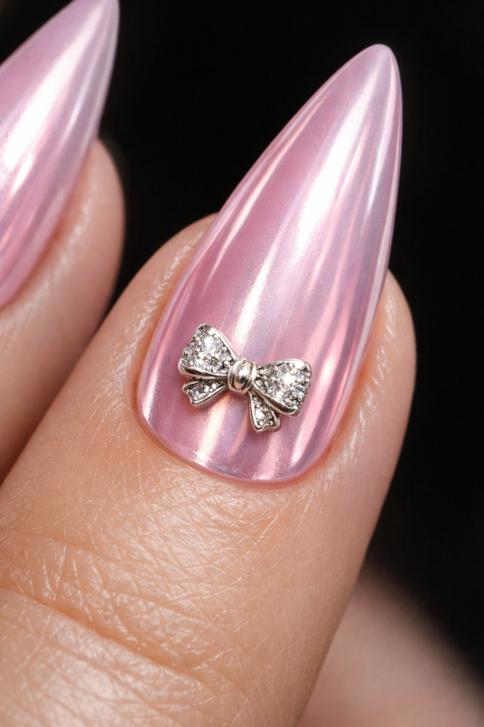 The light pink chrome manicure, adorned with strategic glitter and bows, is more than just a nail trend—it’s a statement of luxurious femininity. It perfectly balances the high-tech appeal of chrome with the romantic charm of classic motifs. Whether you choose subtle painted details or bold 3D charms, this look guarantees an elevated aesthetic.