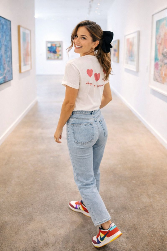 Outfit Idea 7: Graphic Love: Show off your personality with a graphic tee. Choose one with a subtle V-Day message or a fun, vibrant design. Tuck it into light wash jeans and finish with colorful sneakers for an unexpected pop.
