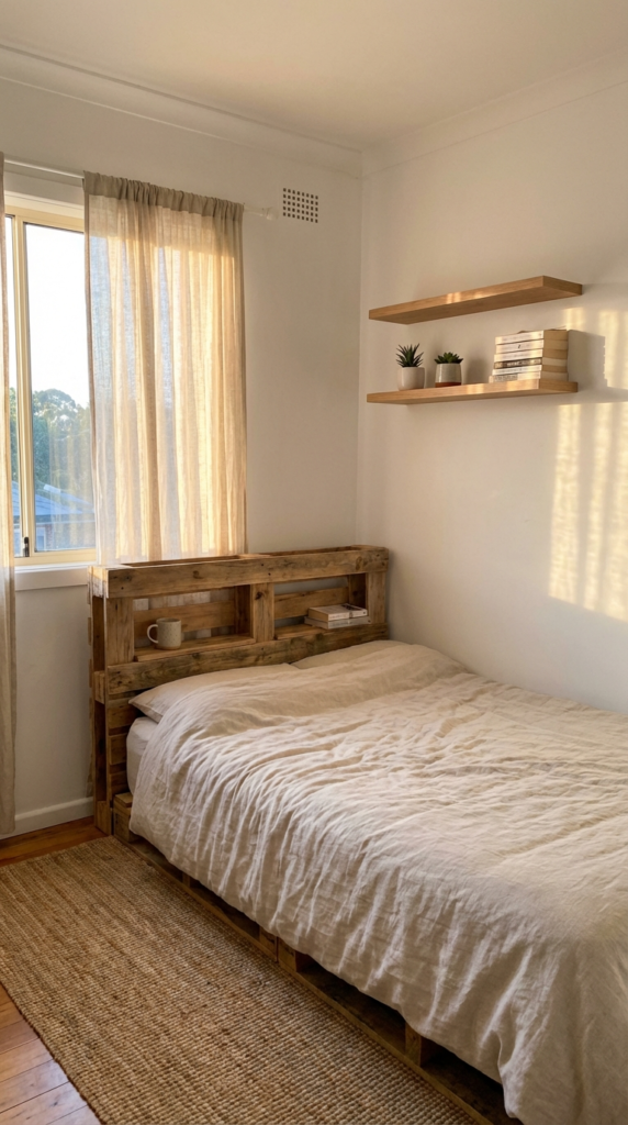 - DIY Headboard with Storage: A simple wooden crate or a stack of sturdy old books can be repurposed into a minimalist headboard with a built-in shelf for your phone or a small lamp.