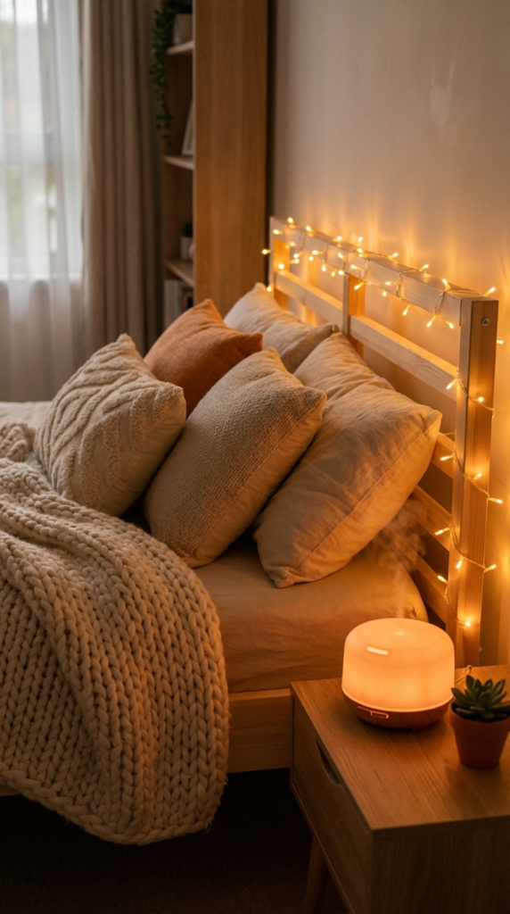 - Warm Lighting: Ditch harsh overhead lights. Opt for lamps with warm bulbs or add a string of Warm White Fairy String Lights around your headboard or mirror for an instantly dreamy glow.