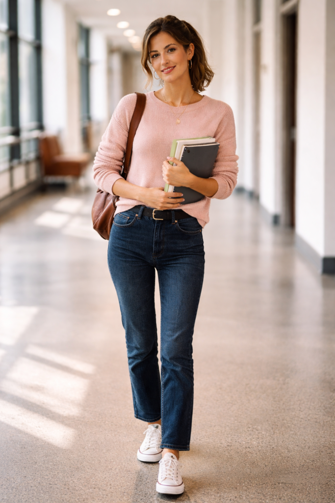 Start with a high-quality knit sweater in a blush pink, soft cream, or a muted red. This is your anchor piece. Pair it with your favorite dark wash straight-leg jeans. The contrast is chic, and the fit is universally flattering and comfortable for sitting in classes all day. White canvas sneakers keep the look grounded and practical.