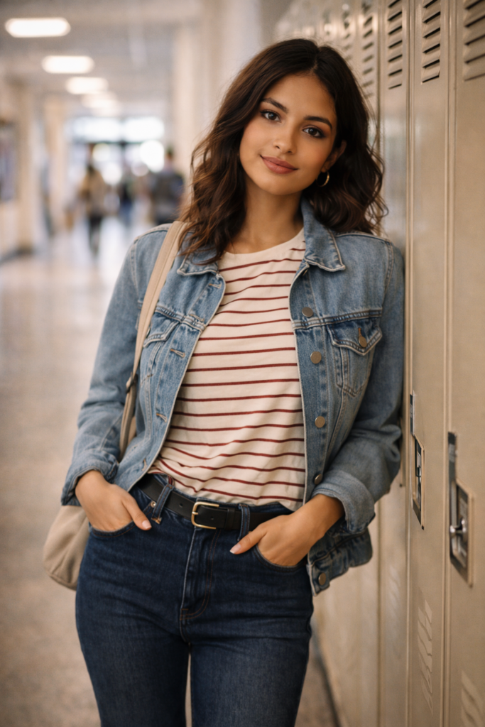Start with a classic striped long-sleeve t-shirt. If you can find one with muted pink or red stripes, even better! Layer a classic denim jacket over it. This instantly adds a cool, relaxed vibe and extra warmth. For bottoms, a pair of mid-wash slim-fit jeans are always a reliable choice. They’re comfortable and provide a polished silhouette. If you’re wondering one jeans that go with everything, a mid-wash slim-fit is definitely a contender!