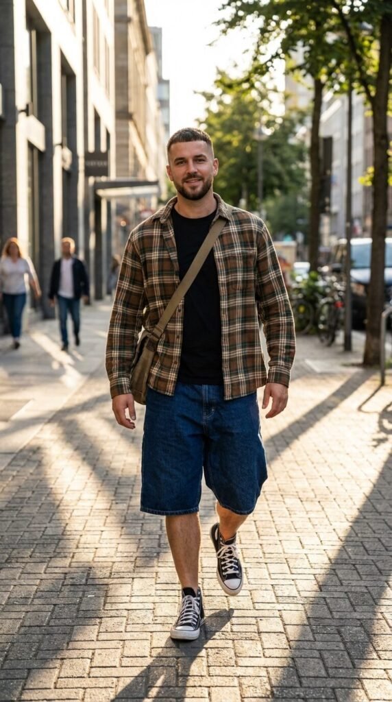 When you want to elevate your jorts look with a bit more edge and personality, layering is your best friend. Start with your baggy blue jorts and a simple crew-neck t-shirt (white, black, or a neutral tone works best as a base). Then, add an open button-up shirt over it.