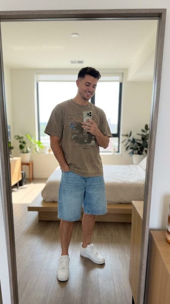 This is your go-to, no-brainer outfit for daily wear. Think relaxed, comfortable, and effortlessly stylish. Pair your baggy blue jorts with a crisp, well-fitting graphic tee or a plain vintage-inspired t-shirt. The key here is to choose a tee that isn’t too tight but also not overly baggy – you want balance.