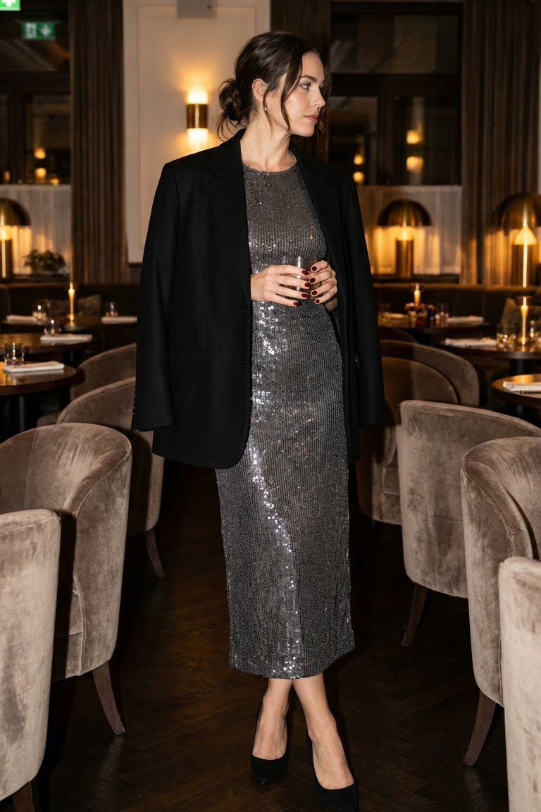 To avoid looking like a disco ball, balance the shimmer with grounded, matte accessories. Pair the dress with a sharp, oversized black wool blazer (worn open) to add structure and a touch of menswear-inspired cool. For footwear, opt for sleek black suede pumps or minimalist strappy heels.