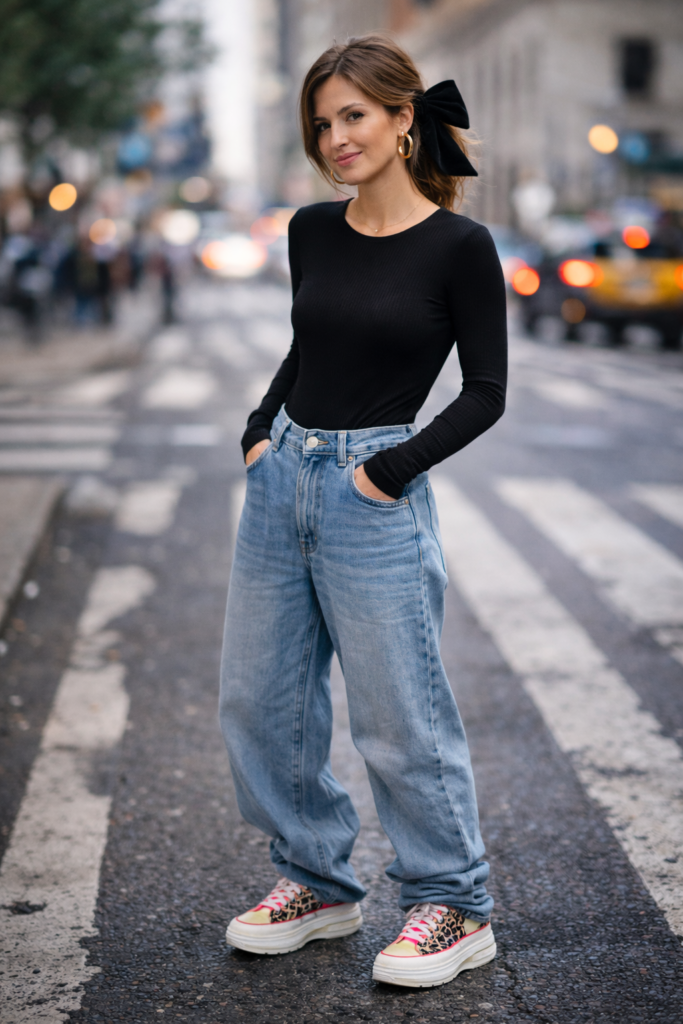Accessories are your secret weapon. Chunky gold hoops, a statement hair bow, or a pair of unique sneakers can pull everything together. Consider pairing a simple black ribbed knit long sleeve bodysuit with your favorite wide-leg trousers or baggy jeans for a comfortable base. Then, add a pop!