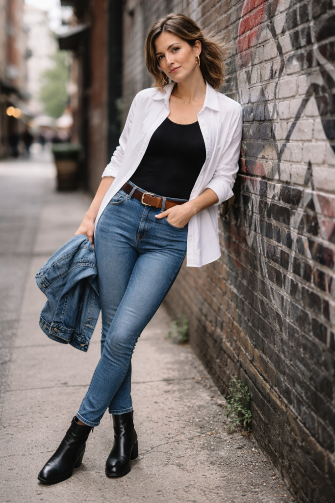 Pair your chosen jeans with something unexpected. A classic white button-down shirt, perhaps styled open over a delicate ribbed knit bodysuit, offers a sophisticated layered look. Roll up the sleeves for that perfect ‘I just threw this on’ vibe. The best way to make this feel special is with thoughtful accessories, like a high-quality brown leather belt and chic ankle boots.