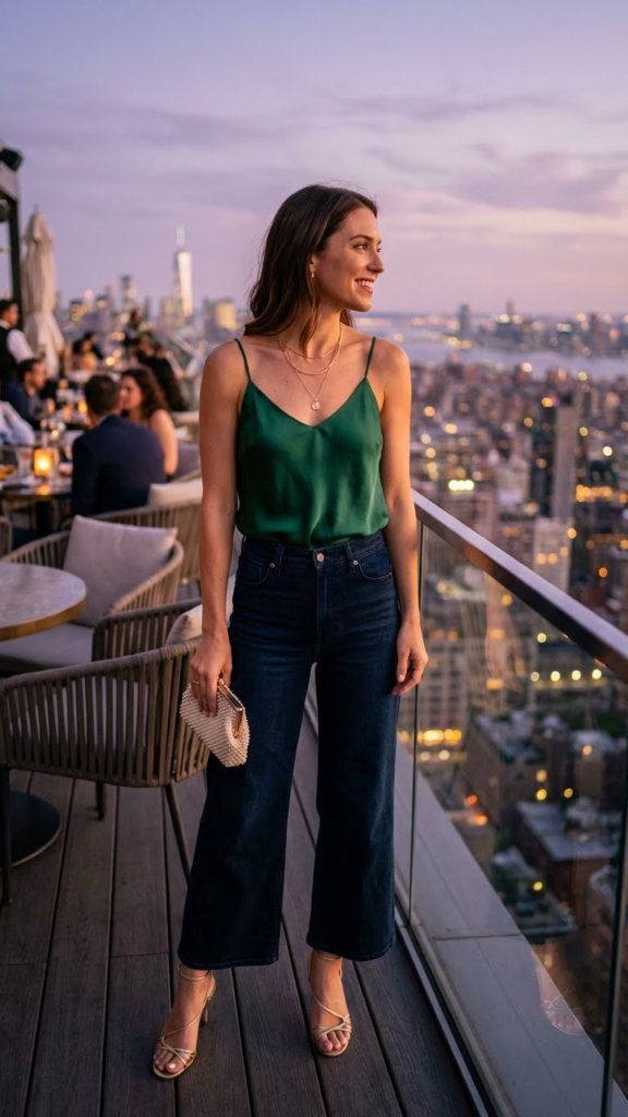 The secret is in the top and the shoes. Opt for a silky camisole, a delicate lace-trimmed tank, or a flowy blouse in a rich jewel tone or a subtle print. These luxurious fabrics instantly elevate the denim.