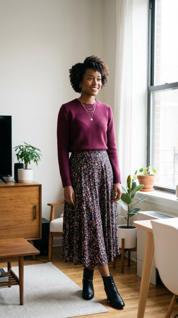 For a slightly more dressed-up casual look, a cozy knit sweater paired with a versatile skirt is a winning formula. Choose a simple knit crew neck sweater in a romantic shade like deep berry, emerald green, or a classic cream. The texture of the knit adds warmth and a touch of luxury.
