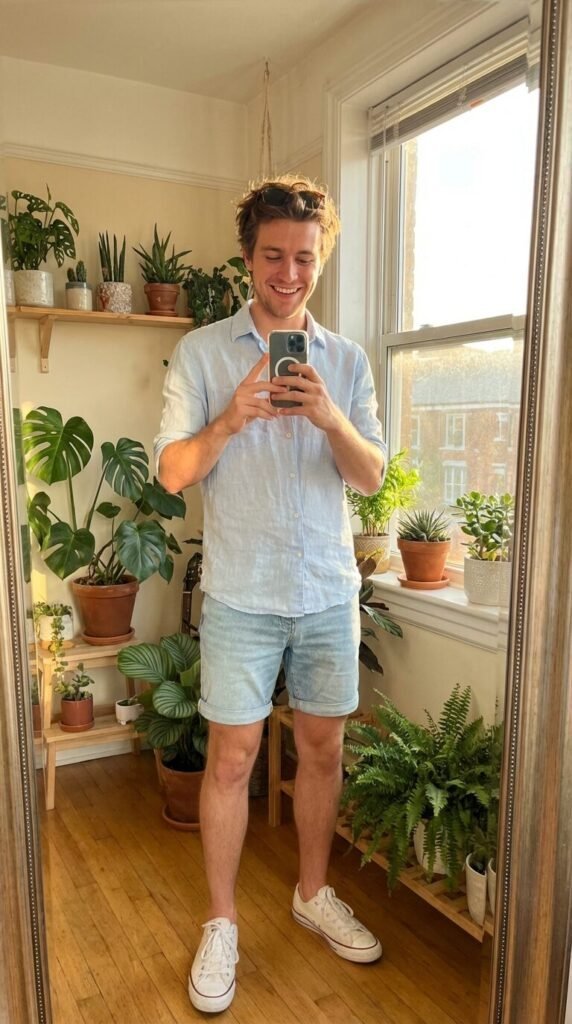 Go for light wash jorts, perhaps with a slightly rolled cuff for a cleaner look. Combine them with a breezy linen shirt or a relaxed-fit short-sleeve button-up in a subtle print or solid pastel. Keep it untucked. Espadrilles, canvas sneakers, or even clean slide sandals (if school-appropriate) work well here. Sunglasses perched on your head and a casual canvas tote bag for your books complete this easy, stylish vibe.