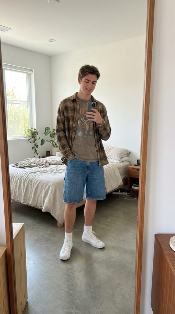 Start with a pair of mid-wash, slightly relaxed-fit jorts that hit just above the knee. Pair them with a graphic tee featuring a vintage band, an abstract design, or a subtle brand logo. Layer a classic unbuttoned flannel shirt over it – bonus points if it’s an earth tone or plaid. Finish with fresh white high-top sneakers and a simple beanie or baseball cap if the weather calls for it. Accessorize minimally with a classic watch or a simple chain.